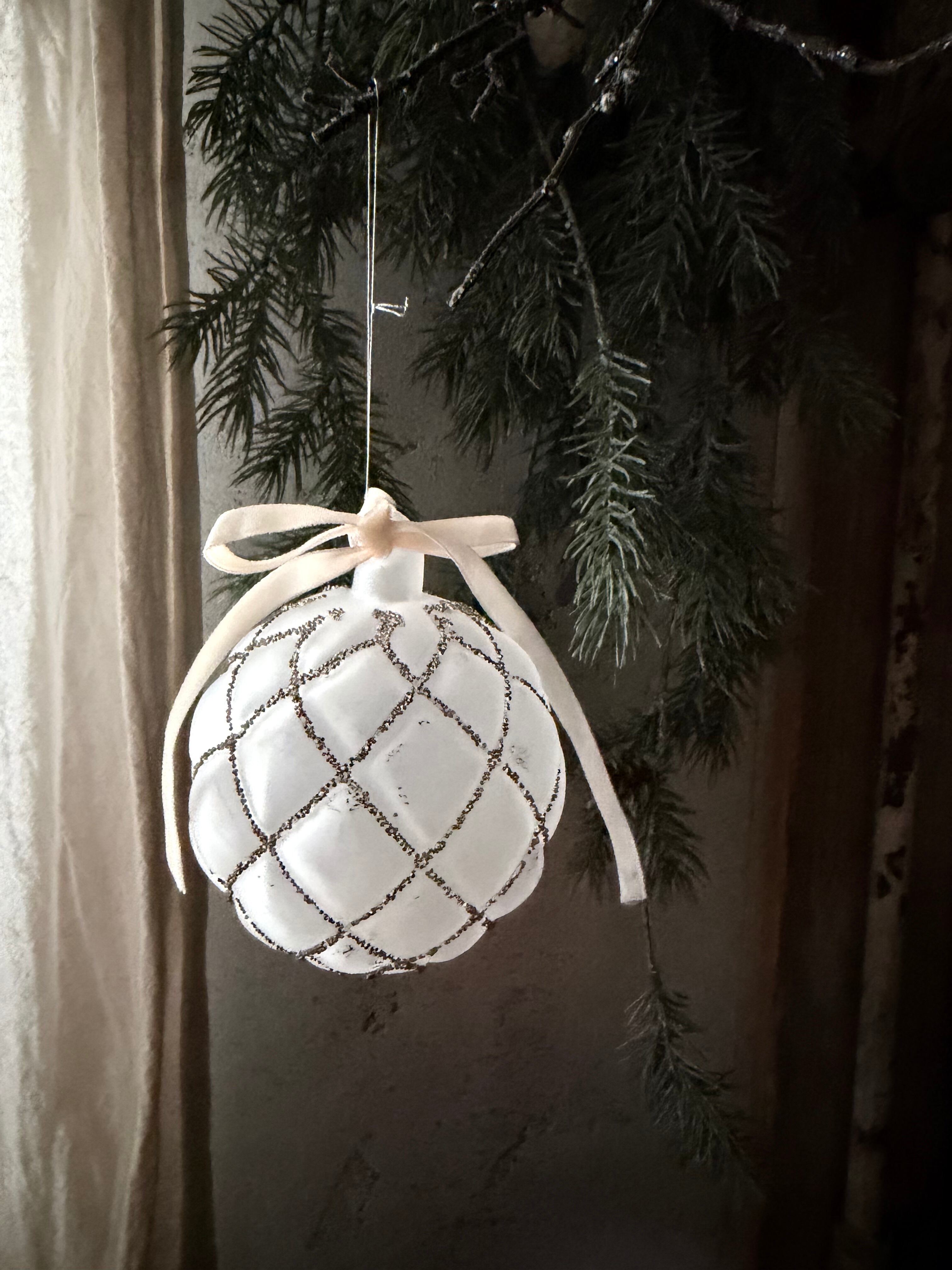 ふんわりとした霧がかった白に、繊細な銀糸のようなラインが映えるガラスオーナメント。