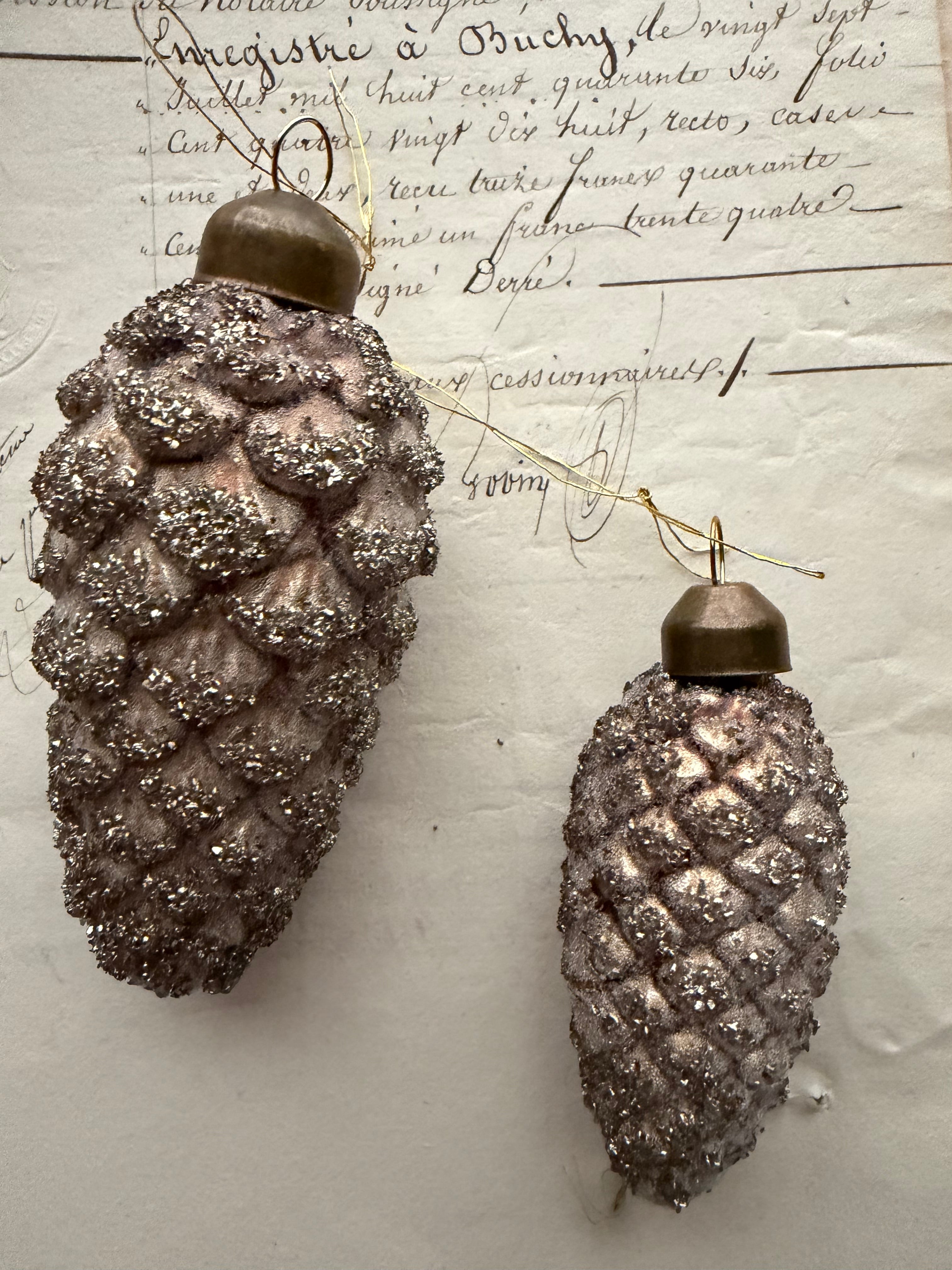 雪化粧をまとった松かさをモチーフにしたガラスオーナメント。