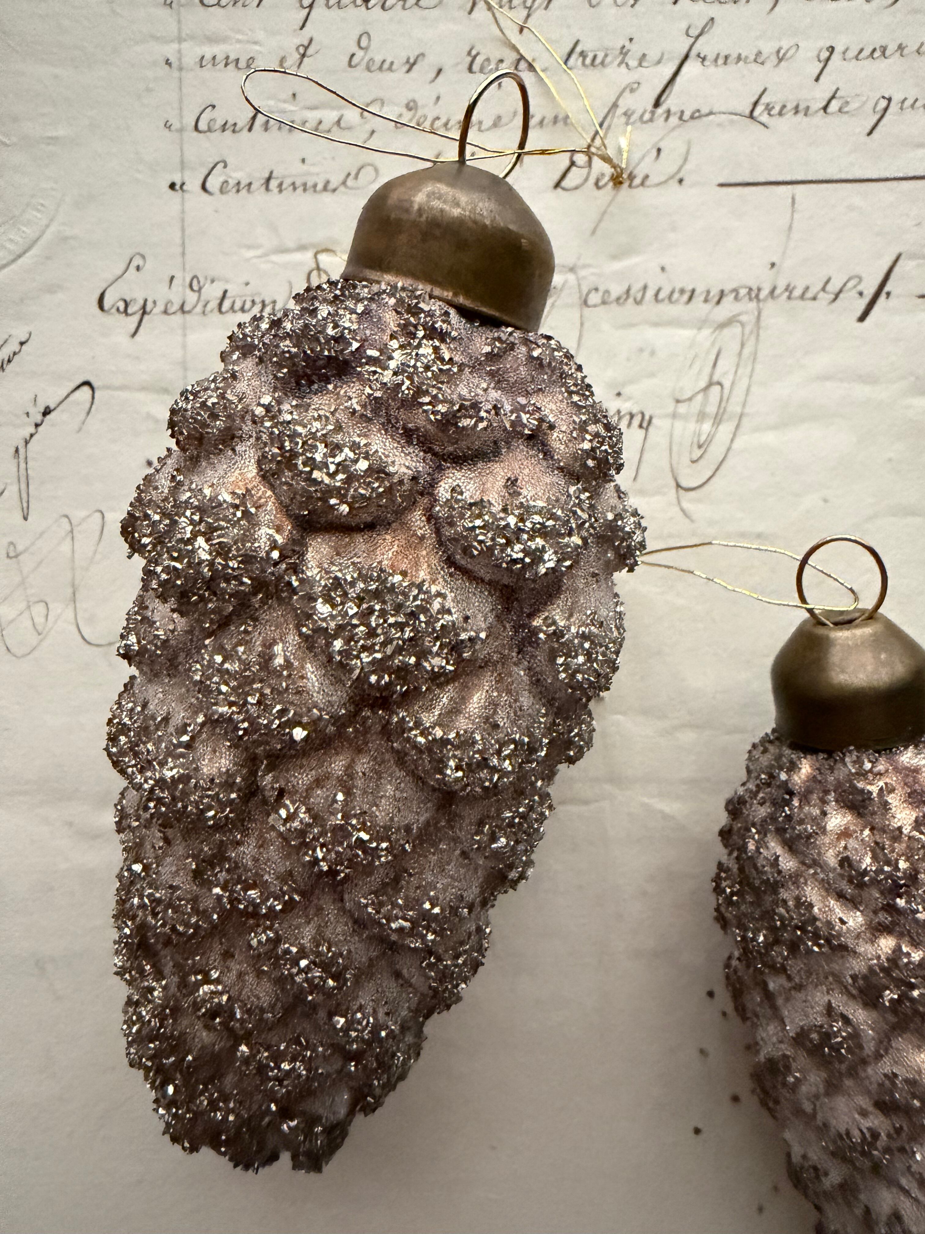 雪化粧をまとった松かさをモチーフにしたガラスオーナメント。