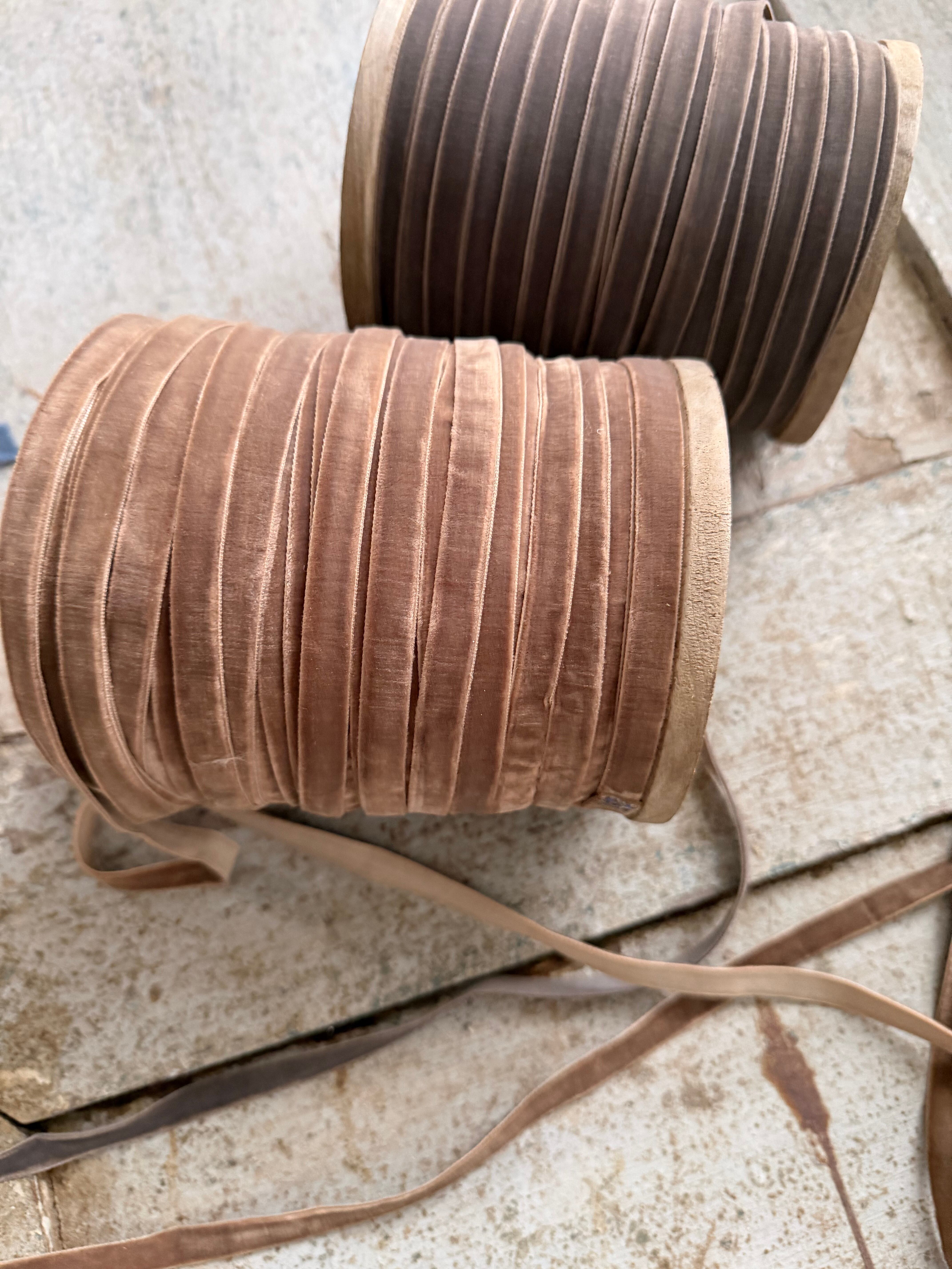 エストニアから入荷したベロア素材のリボンです。 マットで上品なニュアンスカラーです。 写真の手前、淡いベージュ色です 触れると独特なくたっとした手触りです。まるで古布のようです。 ツリーやリースに結んでお楽しみください。 1cm×1m