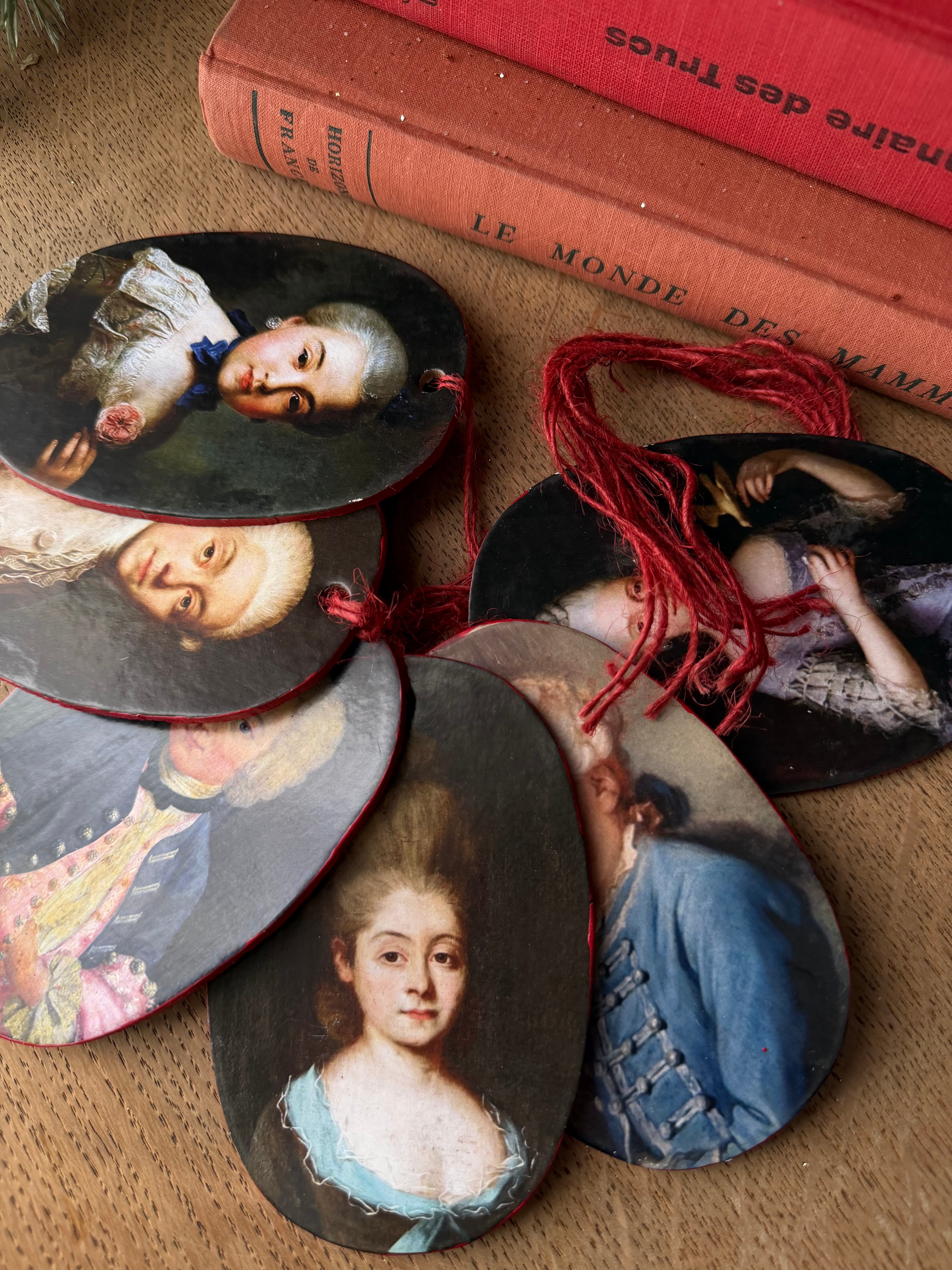 フランスより入荷した厚みのあるペーパーオーナメントです 縁取りが赤くシックな印象です 6枚の絵柄は人物となっております アンティークな風合いをお楽しみください 高さ12.5センチ 幅8.5センチ