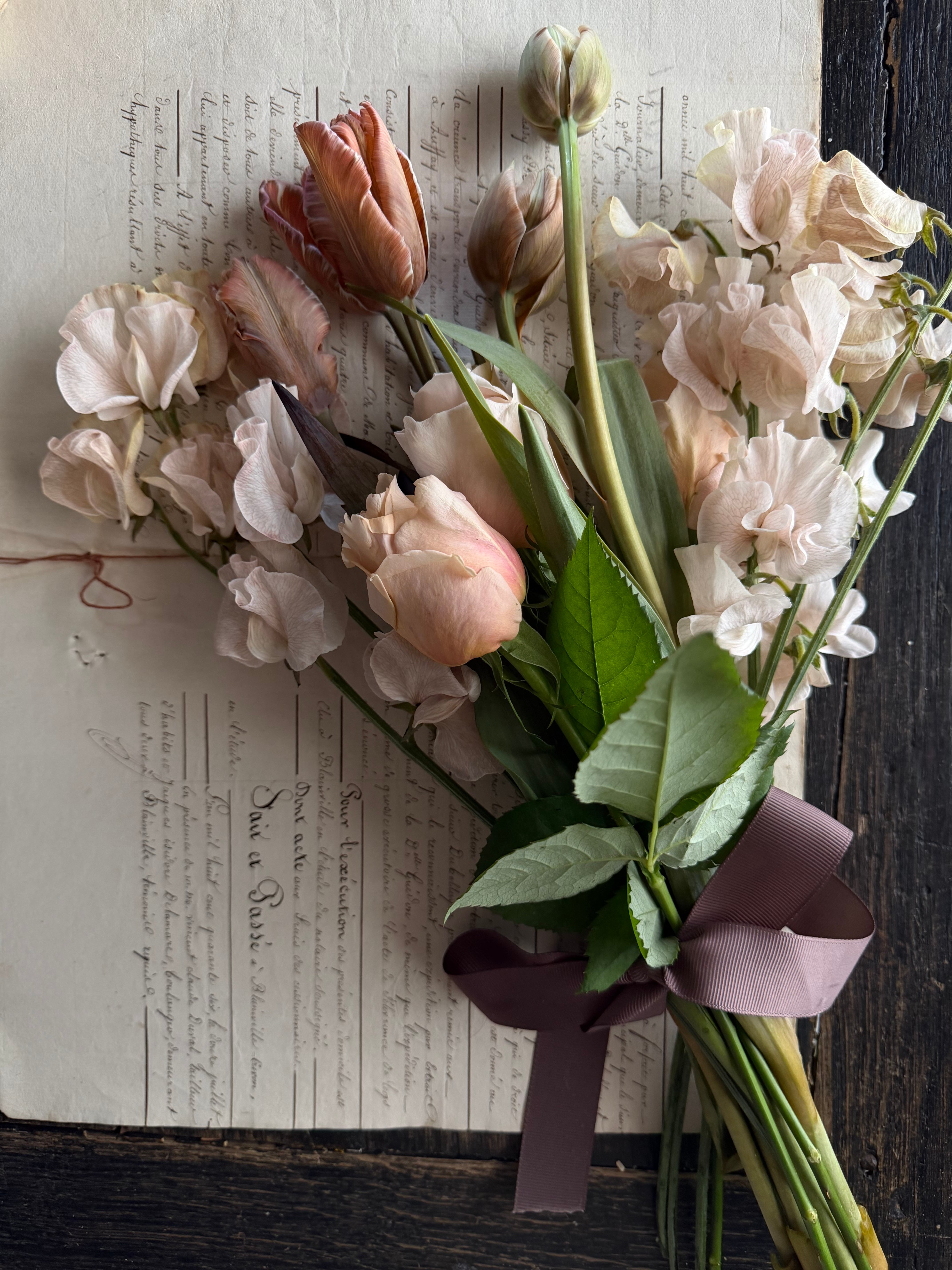 スイトピーのシャビーブラウン5本、チューリップのくすんだ色合いの染め2種類をミックスで5本
