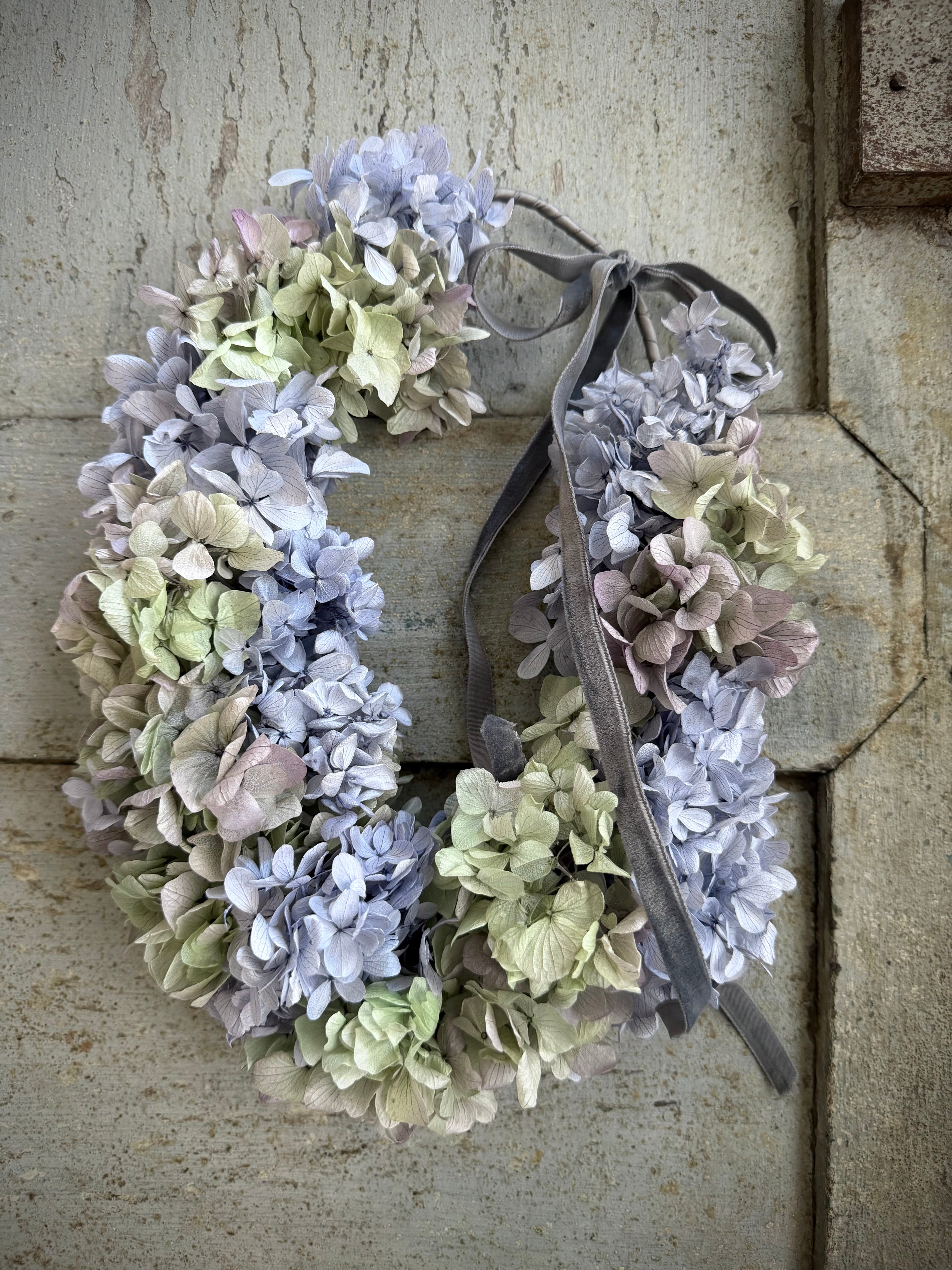 プリザーブドフラワーのあじさいを使用したリースです。 くすみカラーの紫やグリーンにエストニアのベロアリボンでお洒落に飾っていただけます。 サイズ 30cm × 23cm