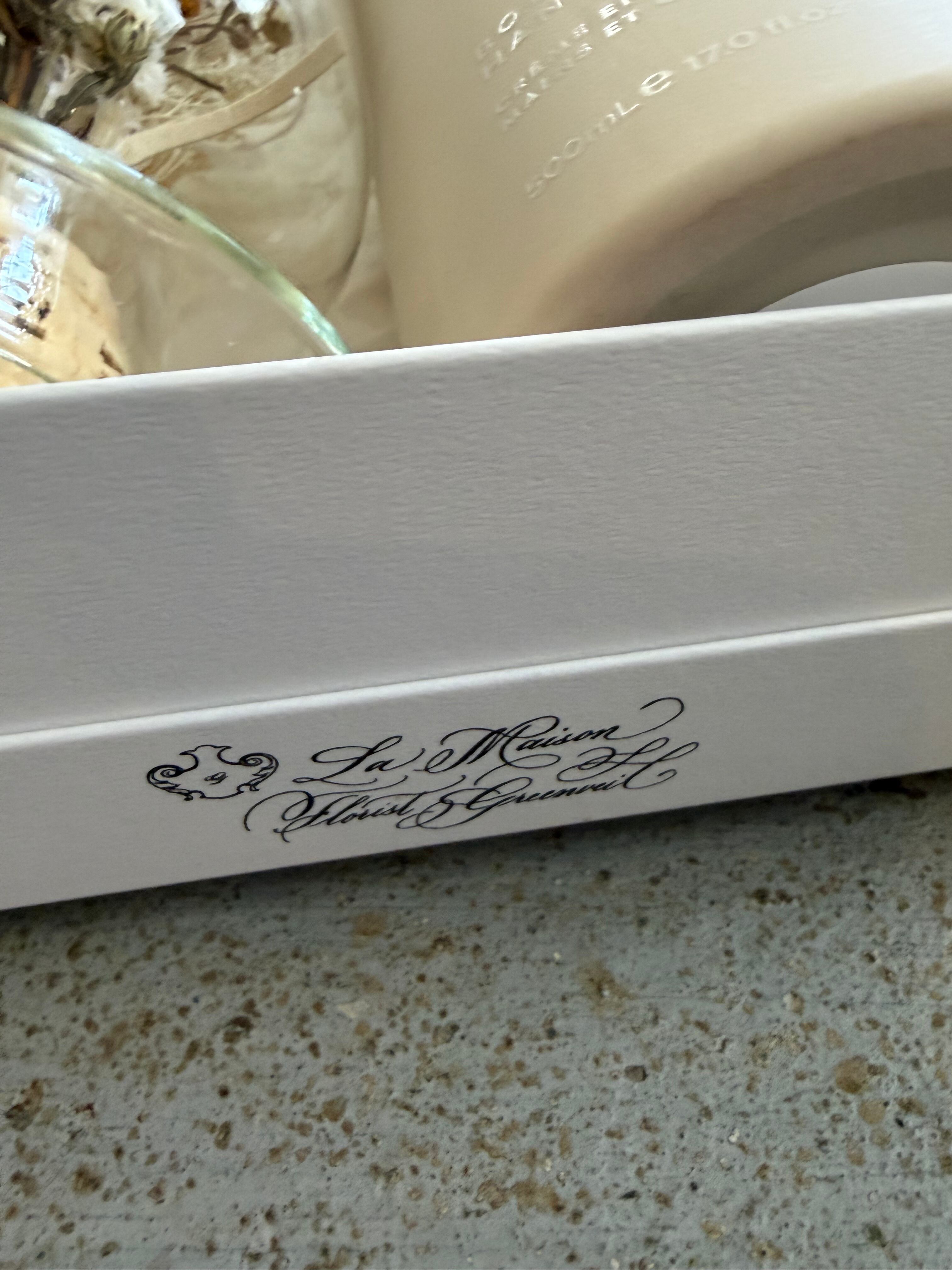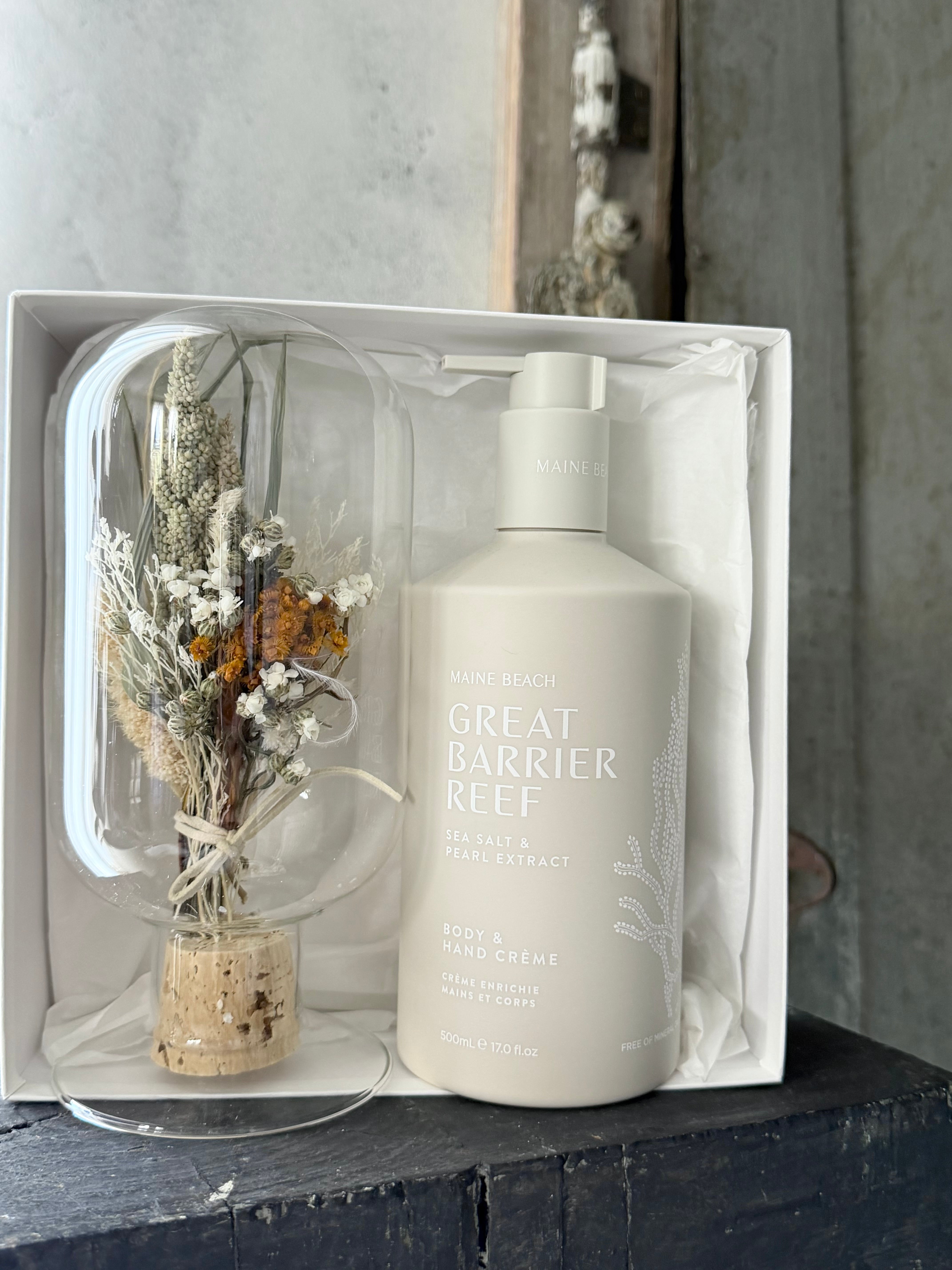 ガラスのドームに入ったドライフラワーとオーストラリアのボディクリームのセットです。