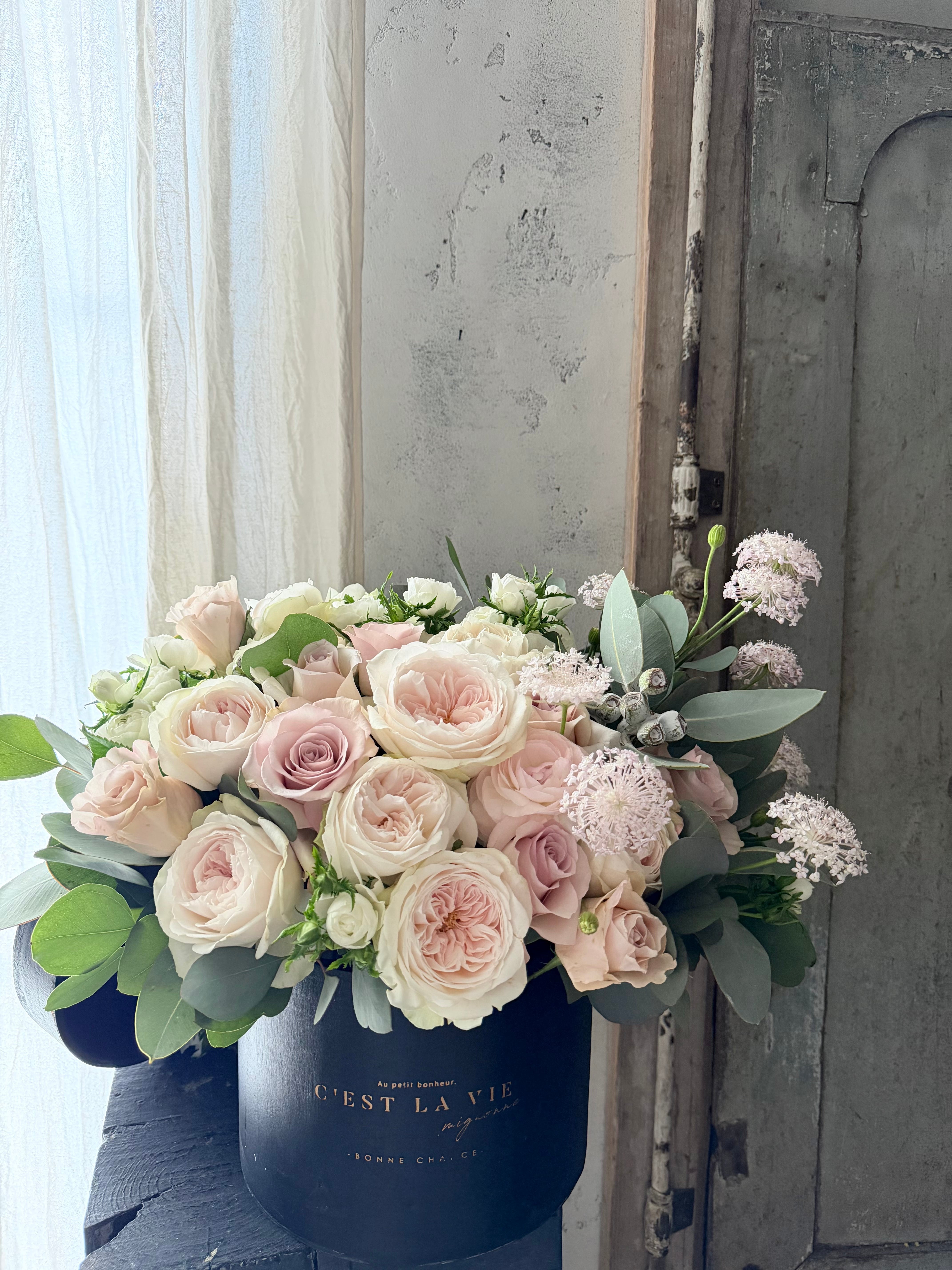 黒いWOOD BOXに、優しい色合いのバラを中心にアレンジメント