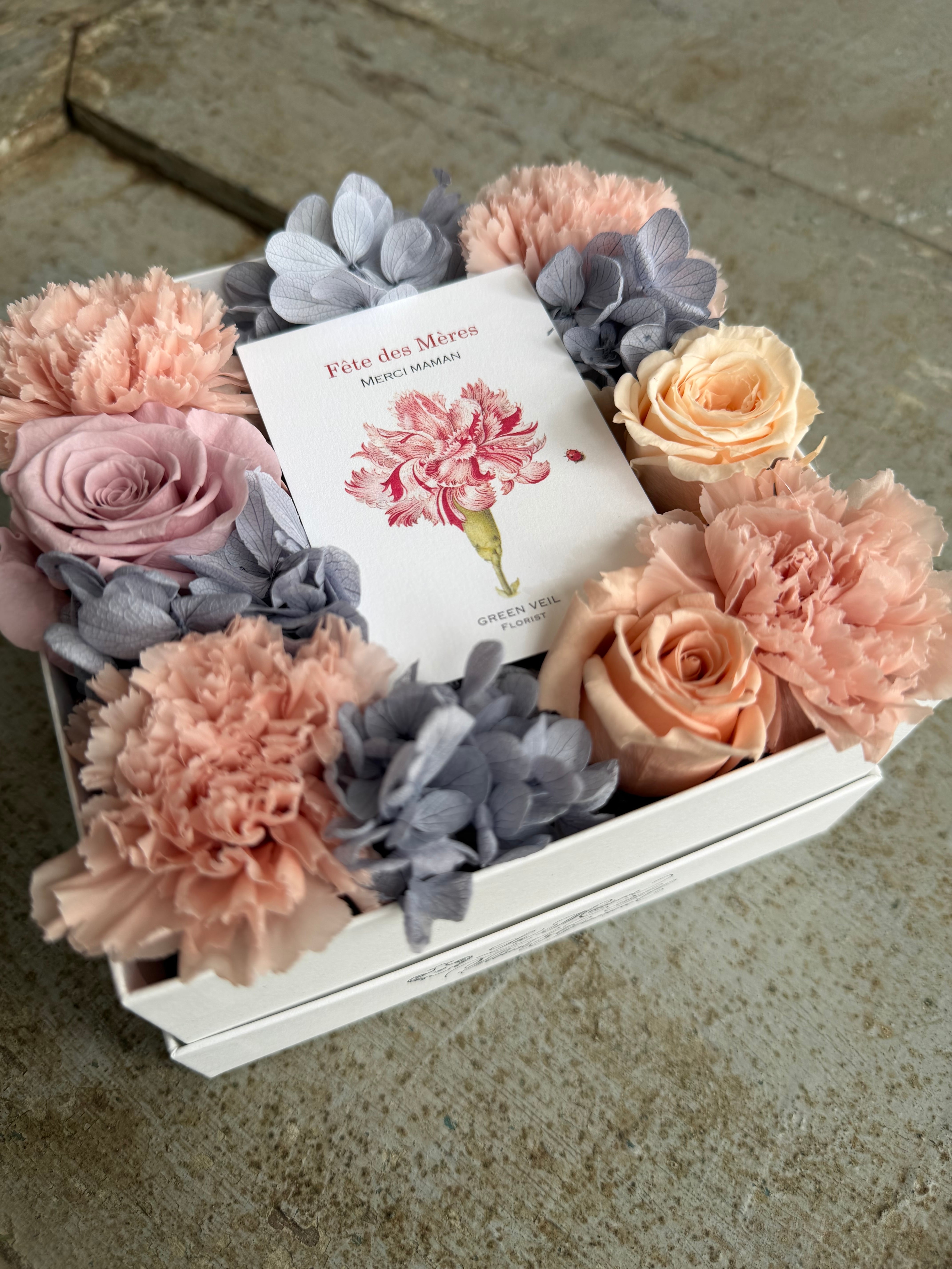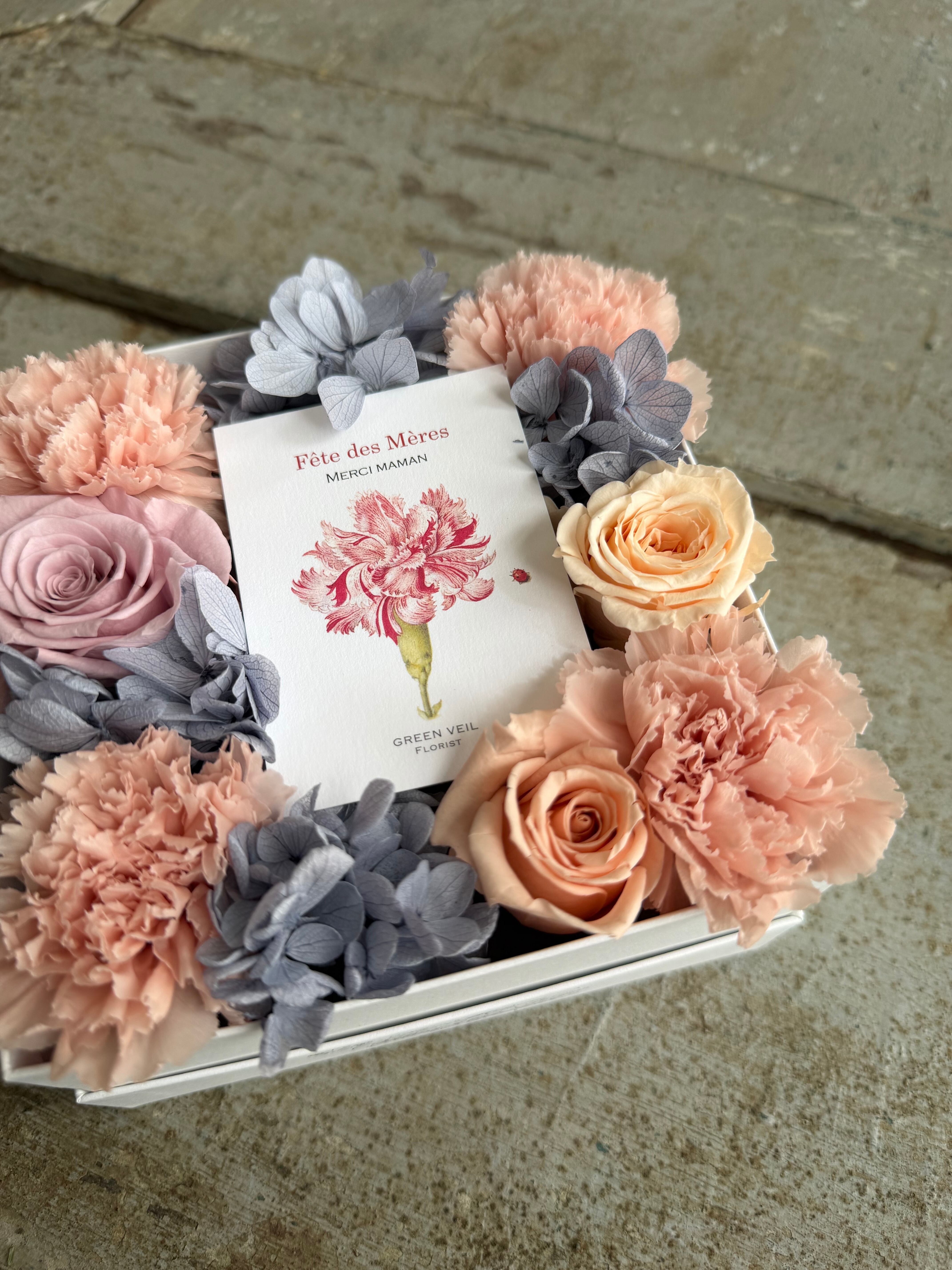 グリーンヴェールオリジナル母の日カードを使用したプリザーブドフラワーのアレンジメントです。 加工されたお花なので、3~5年と長く飾っていただけます。 サイズ 13.5cm×7cm