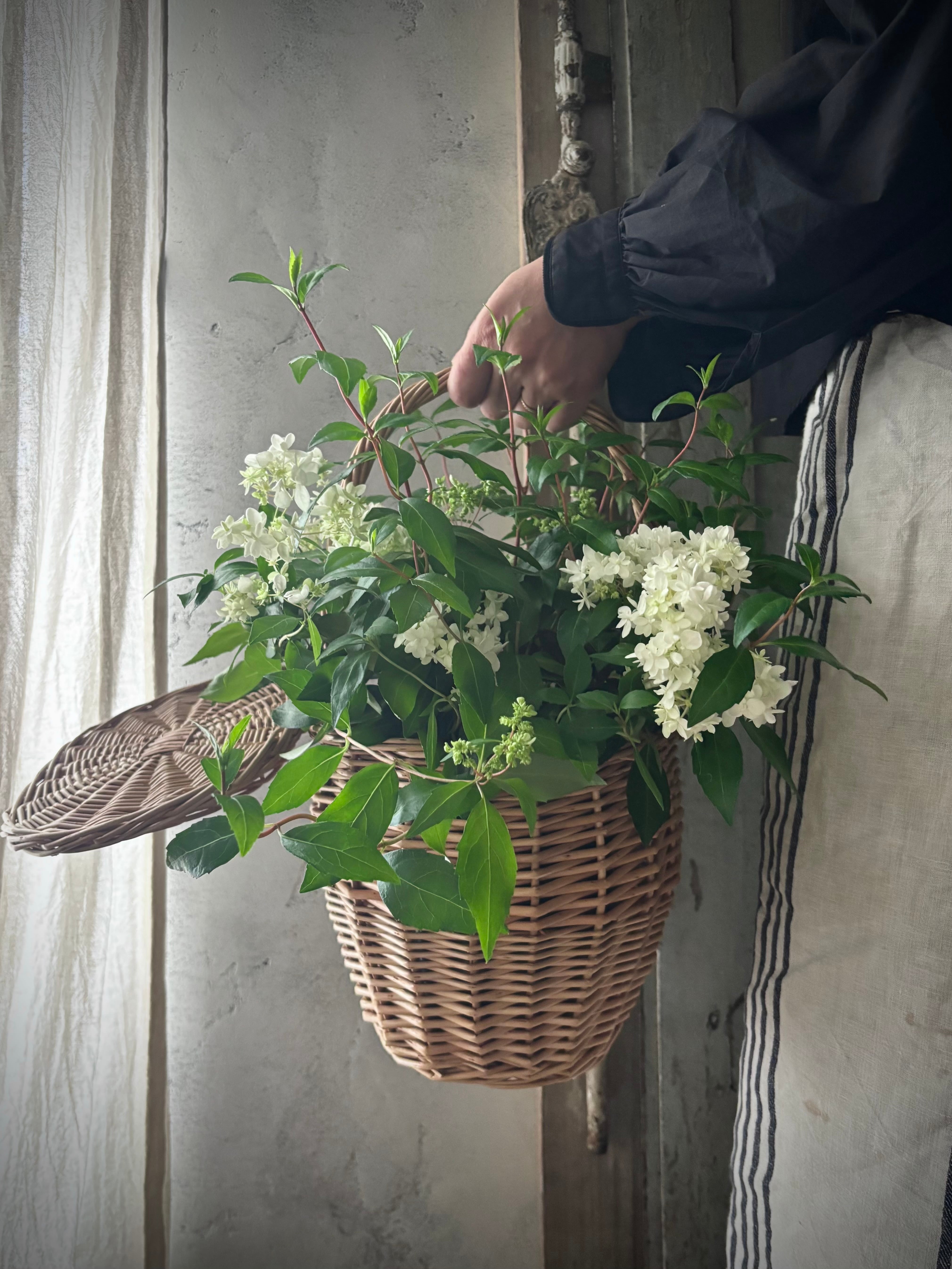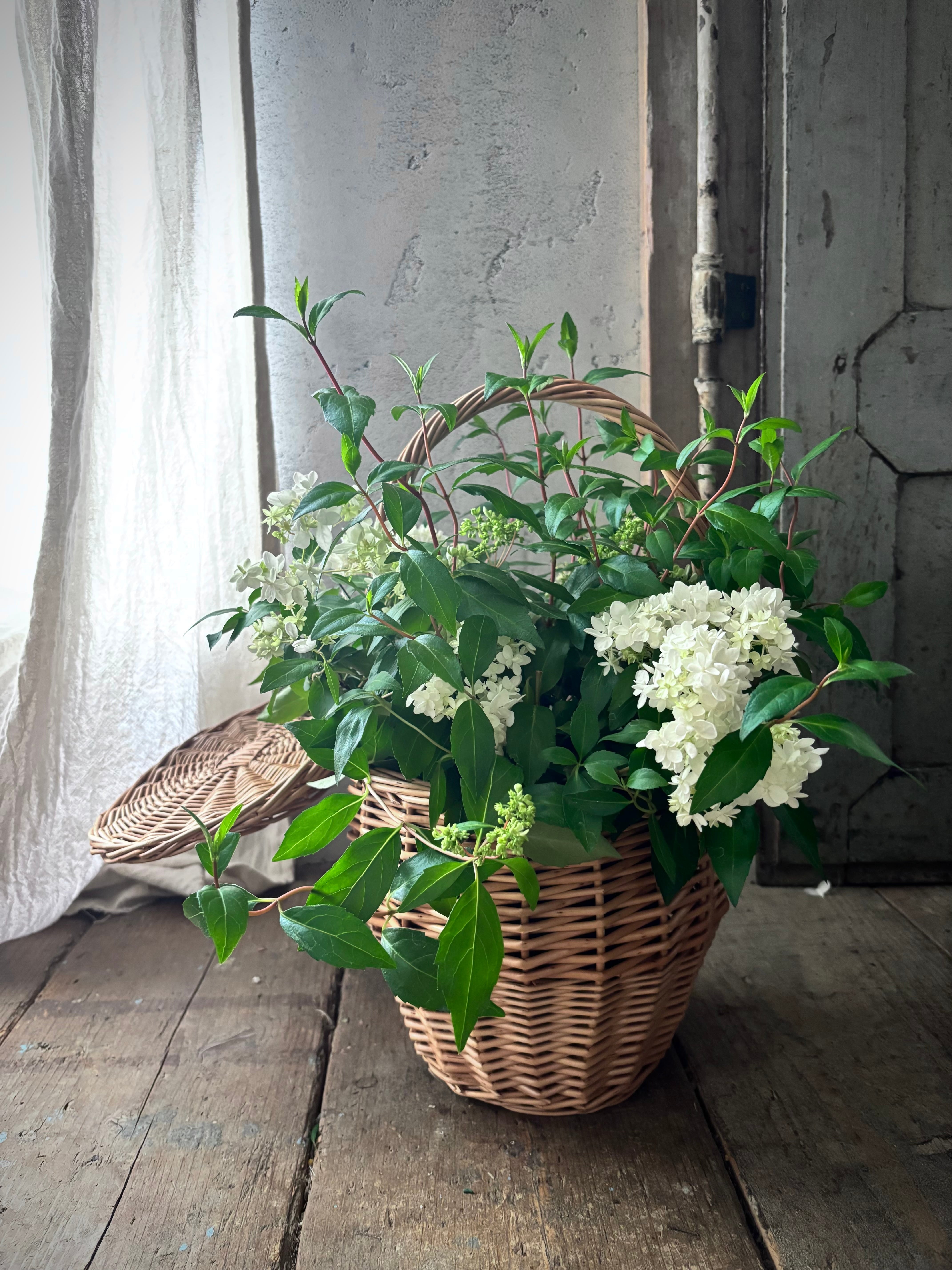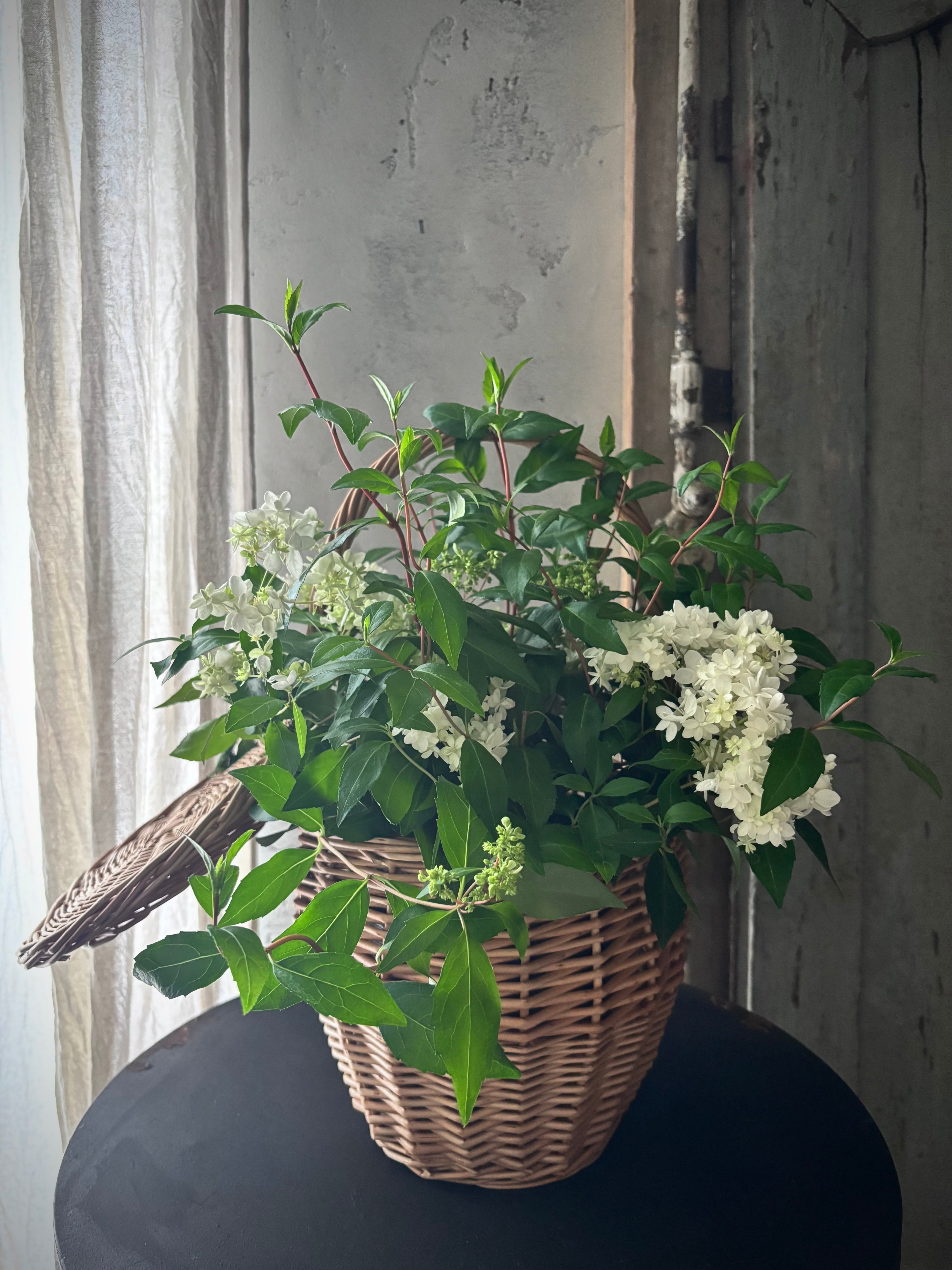 華奢なラインが優しく揺れ動くヤマアジサイをナチュラルなバスケットに入れて特別感のあるギフトセットにしました。