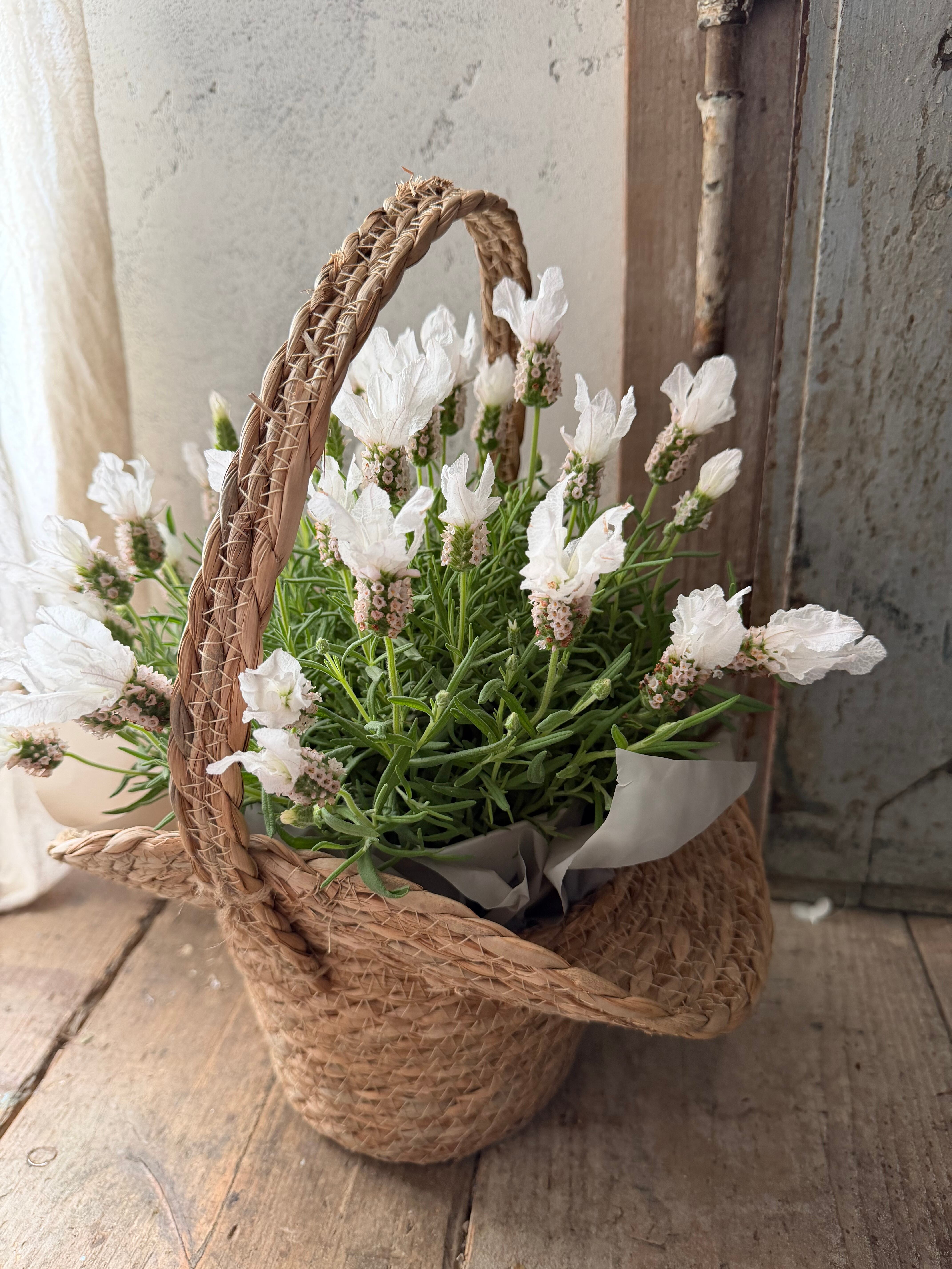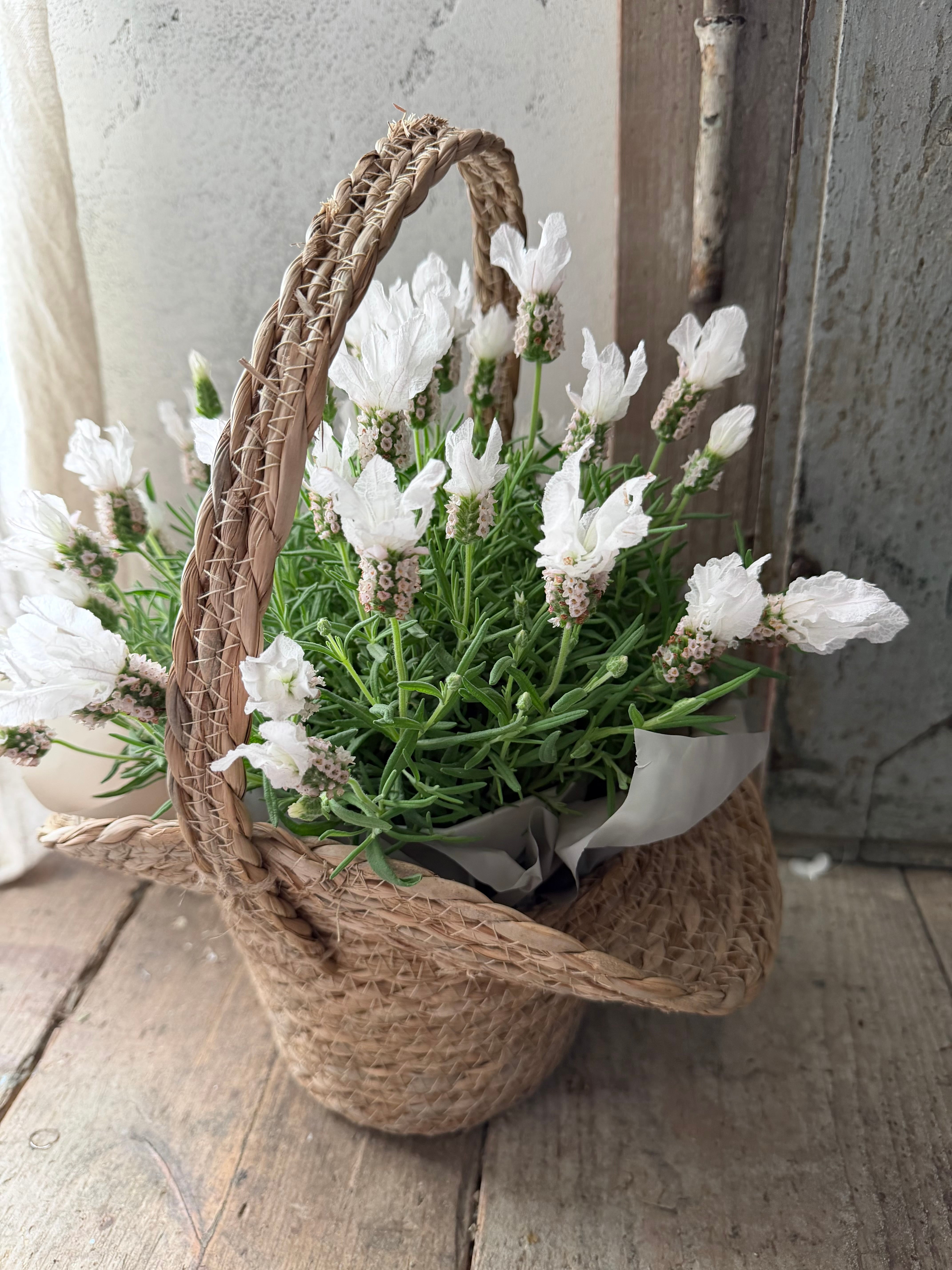 爽やかさと可愛らしさ、高貴な雰囲気を持ち合わせたホワイトラベンダーを母の日限定でバスケットとセットにしました。 サイズ 約38cm×26cm