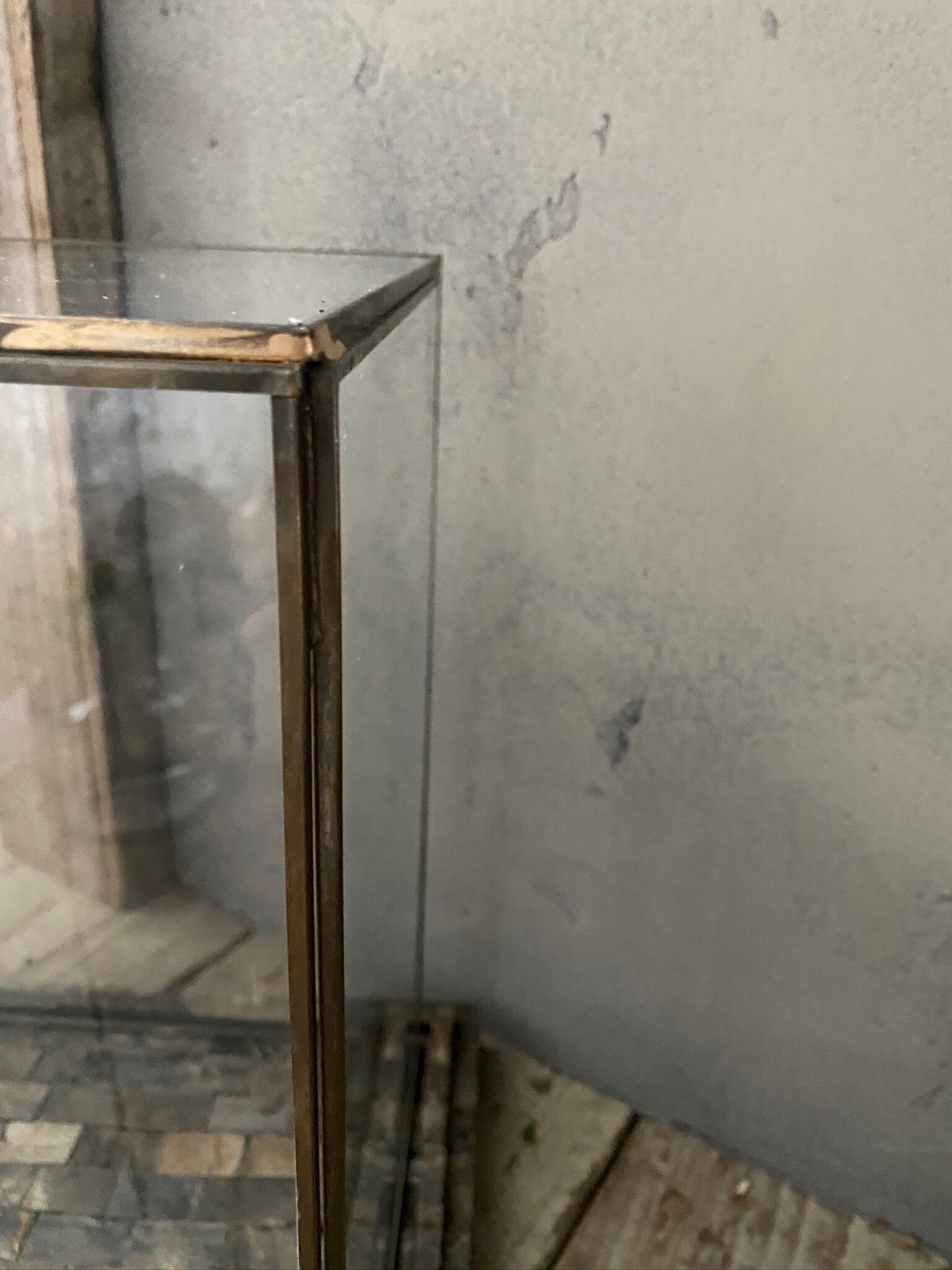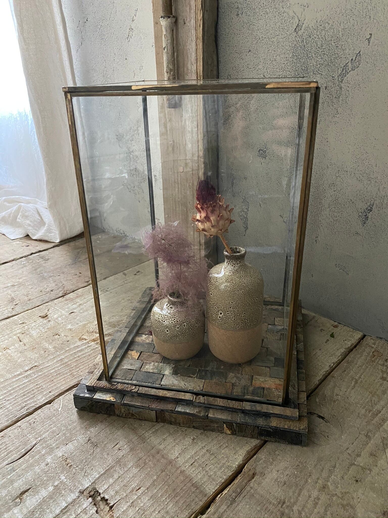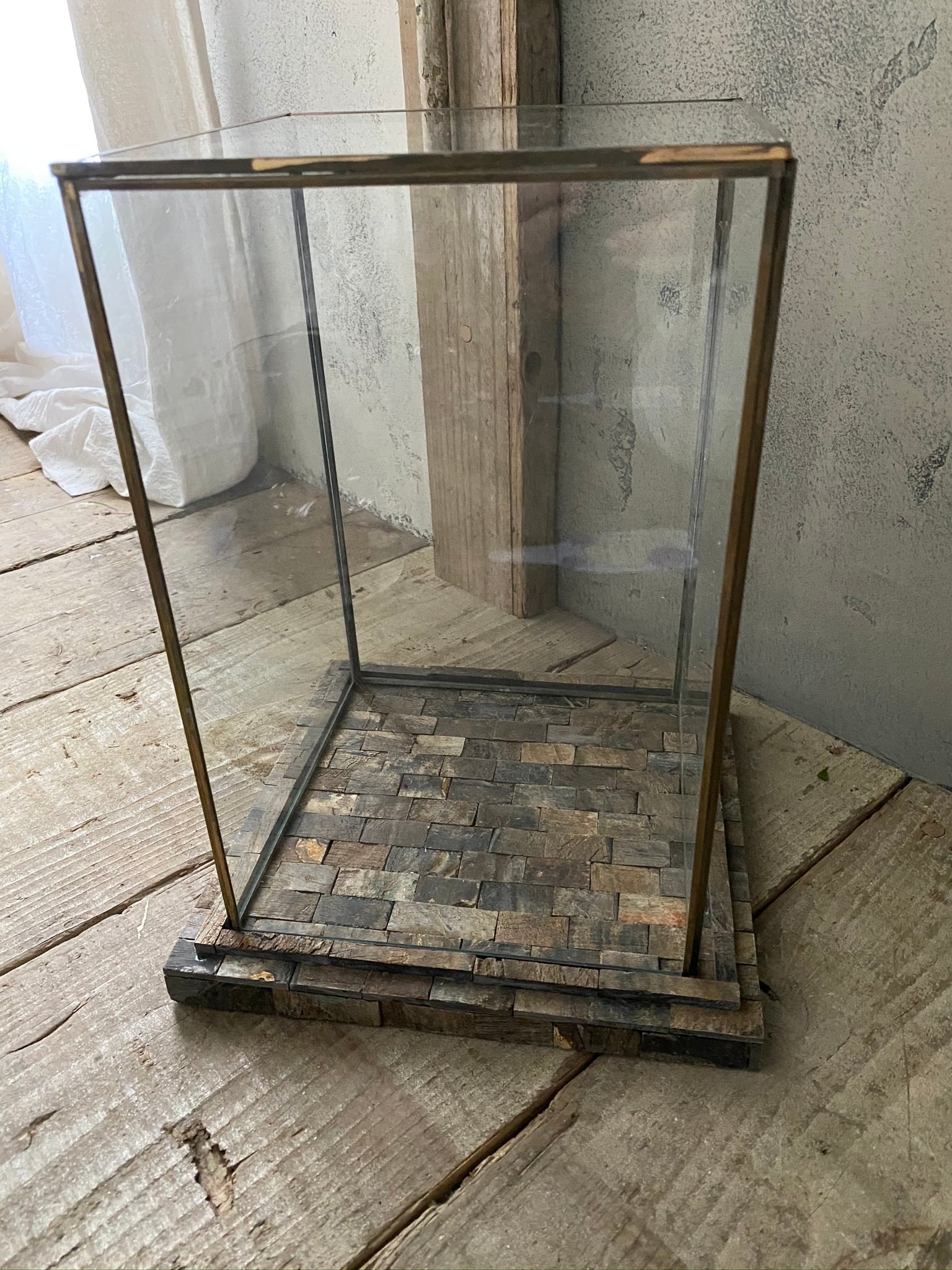 アンティークウッドの組み木でできた底板に、真鍮で縁取りしたガラスケースをかぶせ、中にはお気に入りのものを飾り、お使いください。