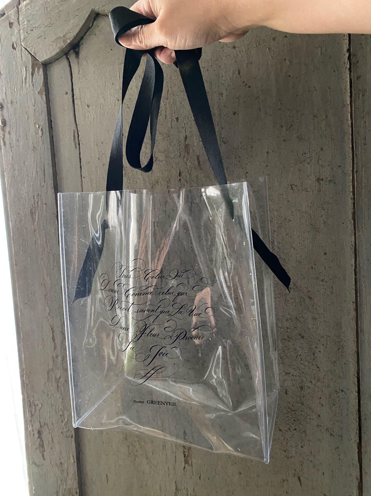 季節のお花を使った生花のブーケを、オリジナルのビニールバッグにお入れしお届けいたします。