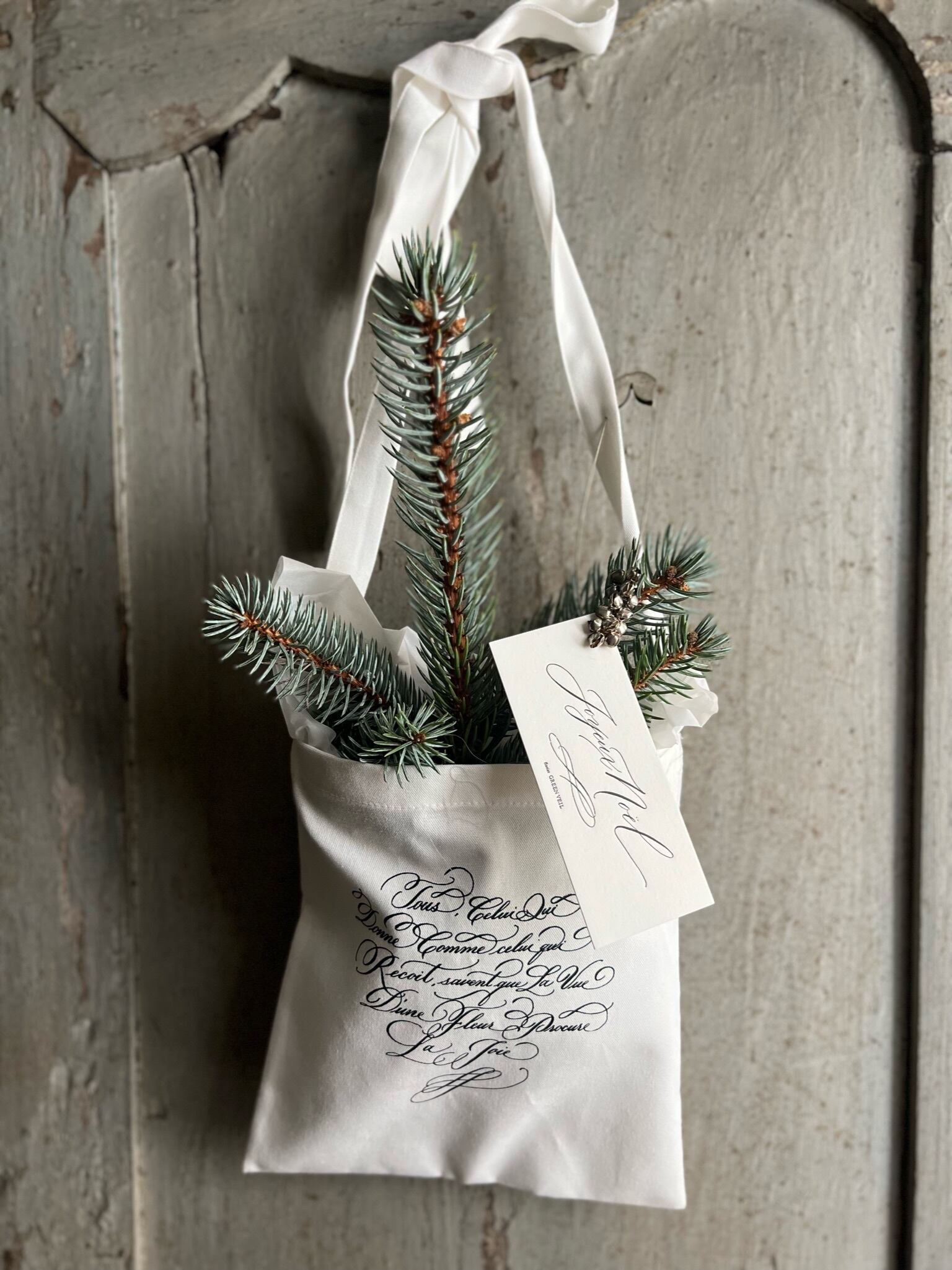 ヴェロニカハリムさんによる素敵なカリグラフィー文字の入ったオリジナルサコッシュと