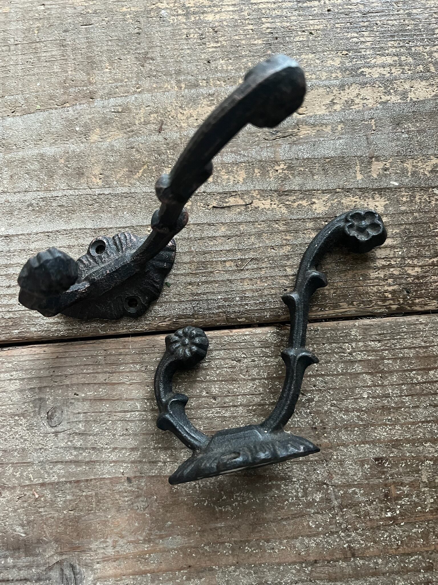 装飾の美しいアイアンのフックとなります こちらの商品はアンティークではありません 価格は一つのお値段です サイズ長さ 14センチ 留め具のサイズ 幅4.8センチ 留め具からフックまでの長さ11センチ 在庫は2個限りとなります